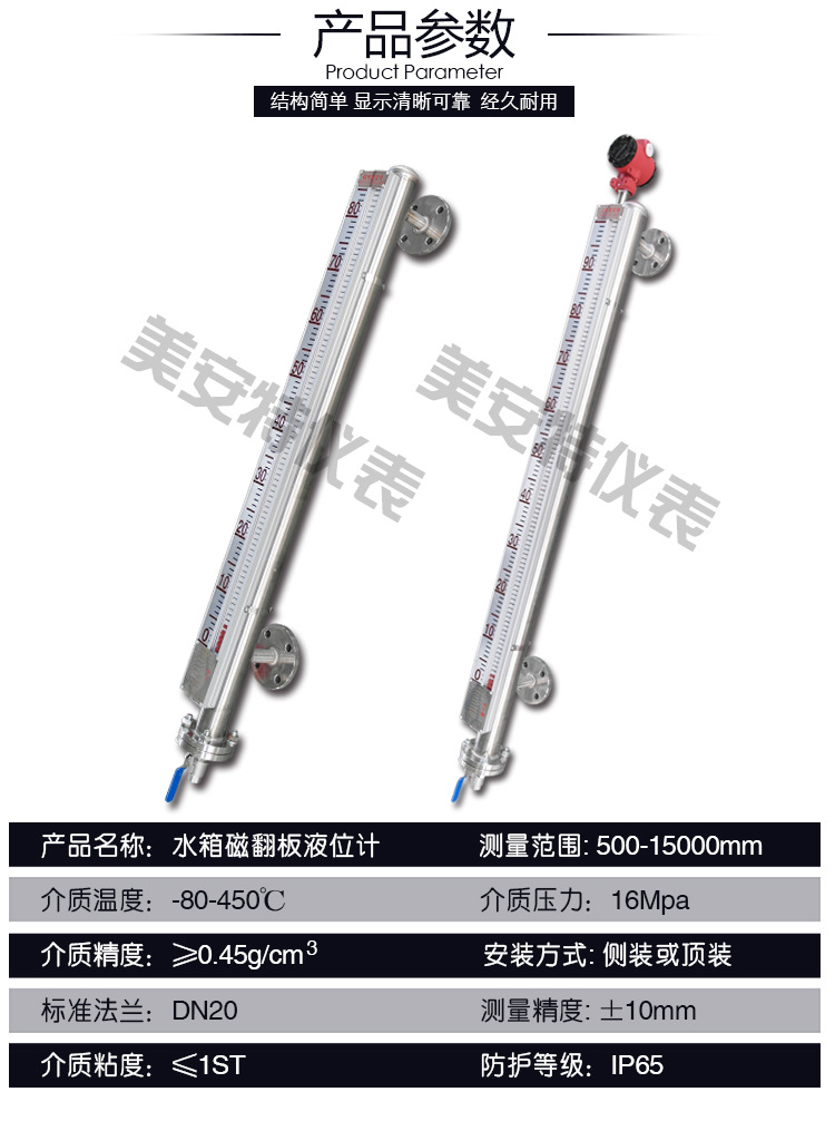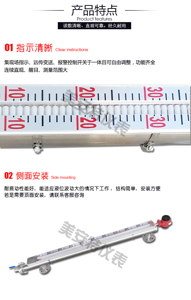 1、以浮子为测量元件,磁钢驱动翻柱显示,无需能源。