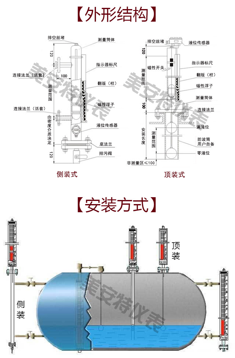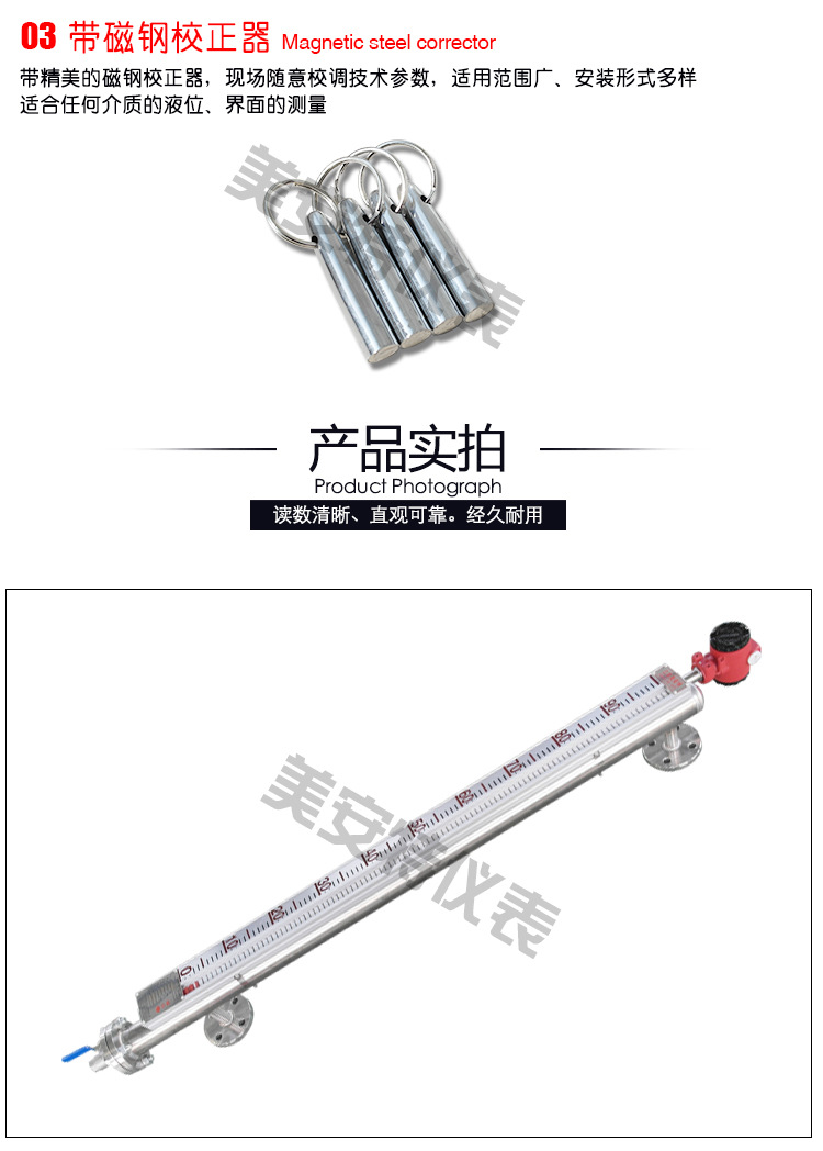 根据浮力原理,浮子在测量管内随液位的升降而上、下移动,浮子内的永久磁钢通过耦合作用,驱动红、白色翻柱翻转180°,液位上升时翻柱由白色转为红色,下降时由红色转为白色,从而实现液位指示。